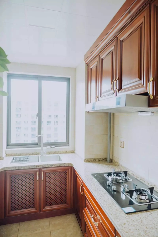 ▲廚房以紅棕色為主調(diào),L型設(shè)計。