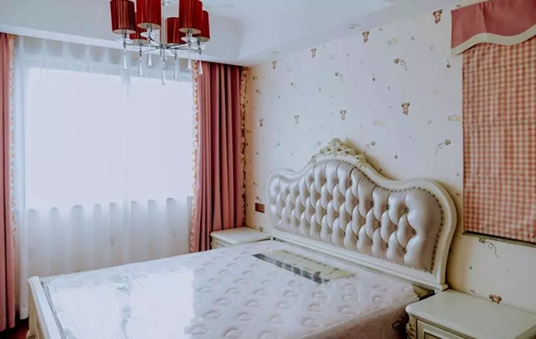 ▲次臥與整體背景的基調(diào)色彩一致,淡粉色再搭配上明亮的空間,碎花的墻紙與床品也是互相呼應(yīng),給人舒適的感覺。