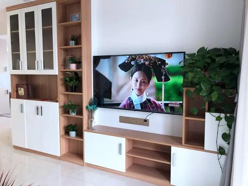 客廳地面通鋪淺色瓷磚,電視背景墻不做修飾,木制電視柜搭配盆栽,散發(fā)北歐風(fēng)的清新格調(diào)。