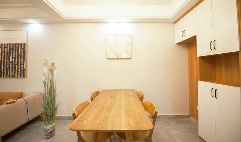 ▲原木餐桌來自我們引進的整裝品牌—意羅尼家居,配上掛畫,柔和的燈光更為空間增添了些許魅力。