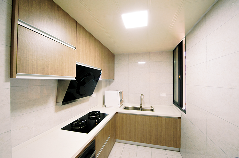 ▲廚房是L型布局,原木紋的櫥柜配上淺色的瓷磚,廚房的櫥柜做到頂, 不僅充分利用了空間,發(fā)揮了強大的收納功能,還不易落灰,打掃起來也方便。
