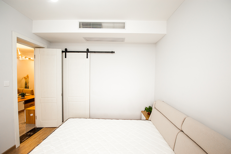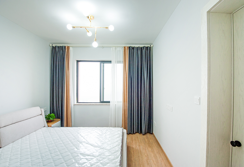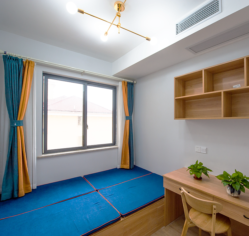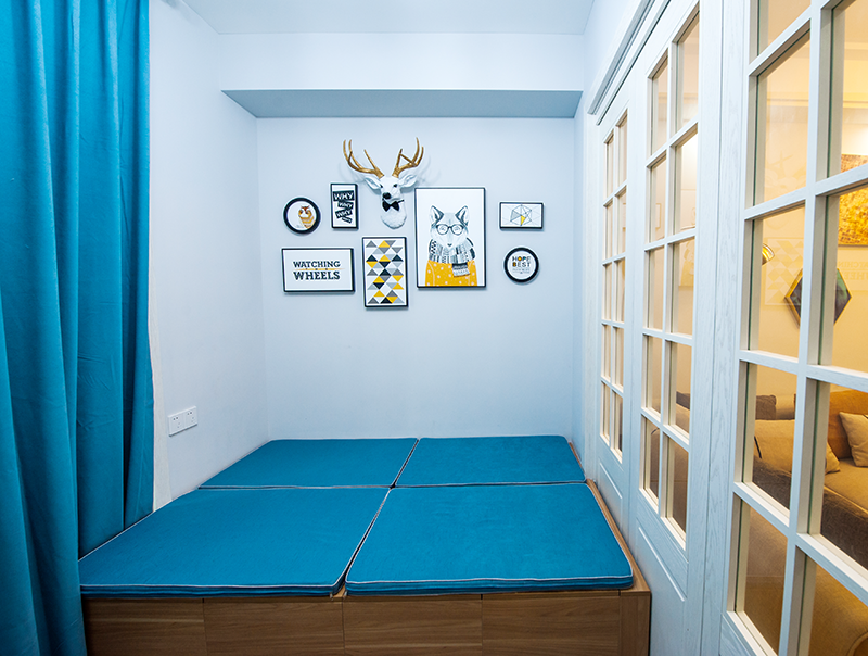 ▲臥室門是隱形門的設(shè)計,與墻面融為一體。主臥的配置比較簡單,原木色與白色相搭的床頭柜, 藍與黃的窗簾色彩,與家里各個角落都能融合的恰到好處。