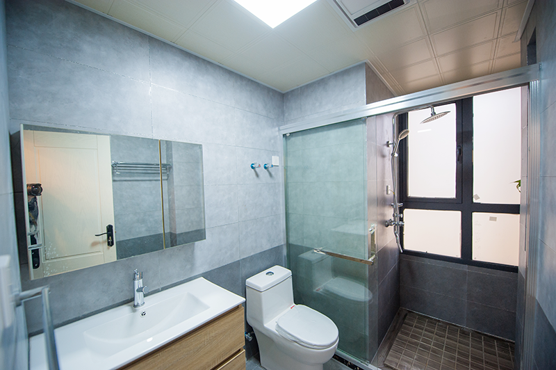 ▲衛(wèi)生間用玻璃隔斷作為干濕分區(qū),墻面以淺灰和深色墻磚搭配,顯得很有質(zhì)感。 鏡柜可以保證收納最大化,原木色的浴室柜懸空設(shè)計,讓整體視覺上感覺更為開闊些。