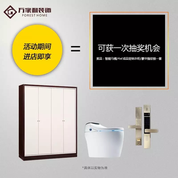 活動(dòng)期間, 進(jìn)店客戶即可抽取價(jià)值 25800元智能馬桶/4㎡成品定制衣柜/品牌進(jìn)戶門(mén)豪華指紋鎖一套(含安裝)