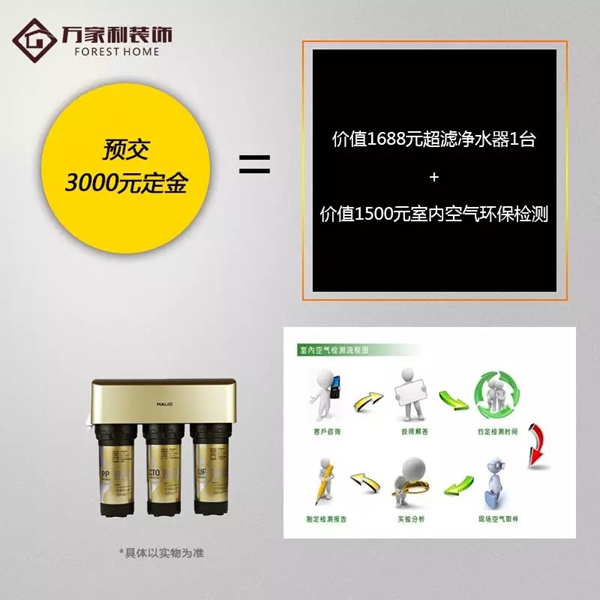 業(yè)主預(yù)交3000元定金即送價(jià)值1688元超濾凈水器1臺(tái)+價(jià)值1500元室內(nèi)空氣環(huán)保檢測(cè),讓您和家人健康居住、健康用水。