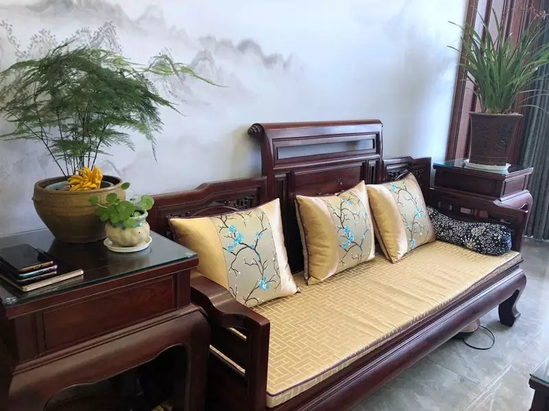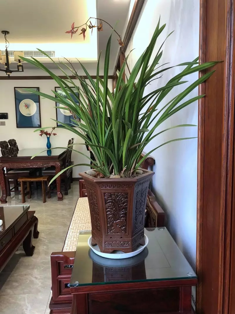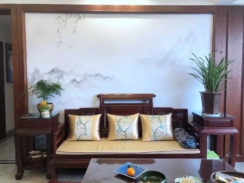 進入客廳區(qū)域水墨寫意背景墻搭配嫻靜的文竹和春蘭,增添了不少書香氣息。