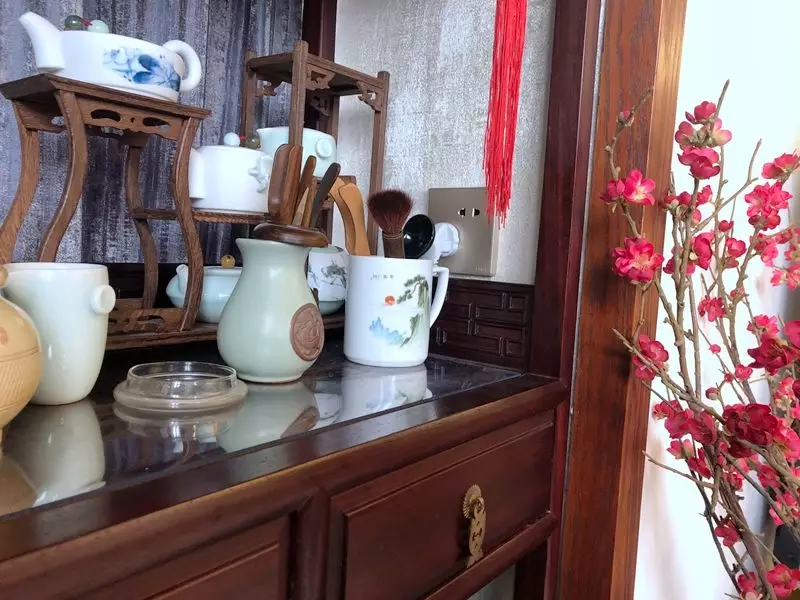 博物架、電視柜擺滿了女主人精心淘來的小物件,木質斗牛擺件、葫蘆、茶藝小品、香薰…熱愛生活,享受生活,徜徉其中。
