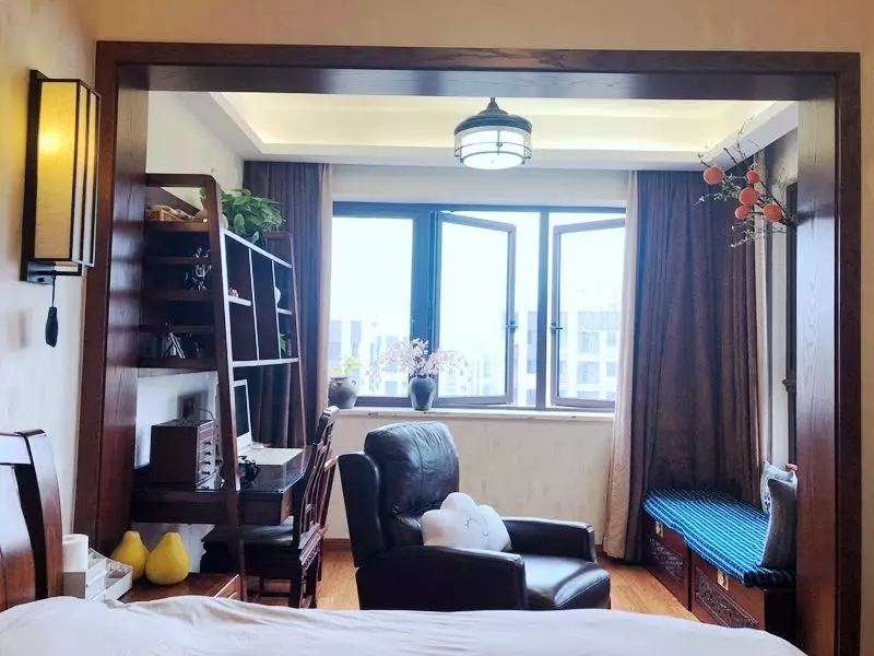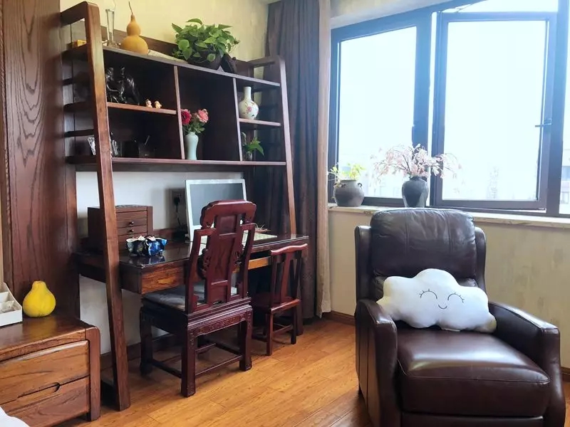 主臥的書桌是老家具,以材質、雕刻見長的中式家具最不怕時間的洗禮,直接搬新家來,搭配新家具還是很和諧的,不突兀~