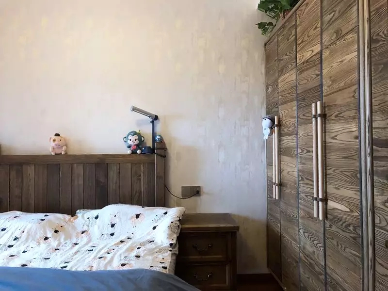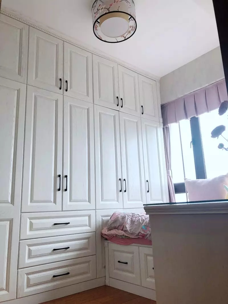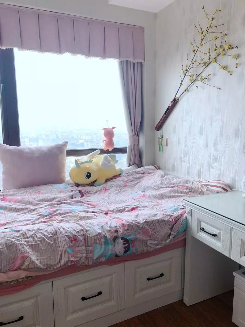 廚房旁邊的小房間整體面積不大,做了整墻的落地柜和榻榻米,桃花燈搭配粉色窗簾布藝少女心十足。
