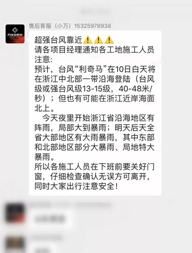 超強(qiáng)臺(tái)風(fēng)登陸的消息 也引起了工程部小伙伴們的重視 昨天開(kāi)始 對(duì)在建施工工地進(jìn)行緊急通知 要求各施工人員在下班前要關(guān)好門窗 以保證業(yè)主施工現(xiàn)場(chǎng)安全