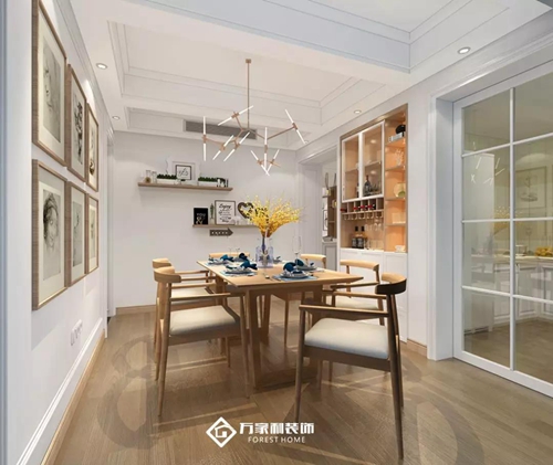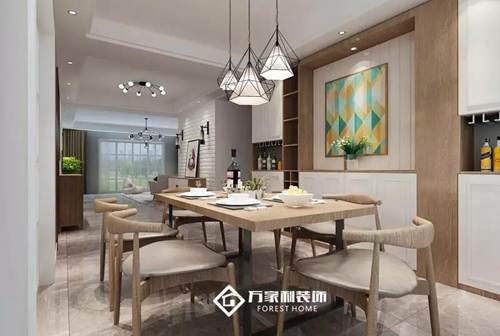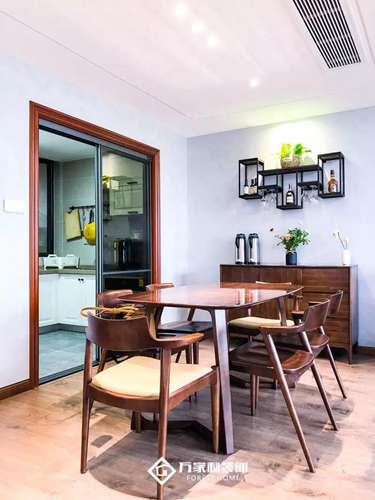 淺棕色木質(zhì)餐桌椅與色調(diào)一致的餐邊柜,相互映襯。復(fù)古的臺(tái)燈搭配原木色的家具、深色的床品,素雅不失溫馨。