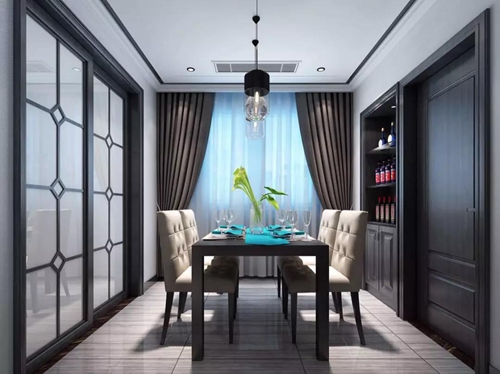 方形餐桌,搭配皮質(zhì)餐椅,餐桌上方掛上造型別致吊燈,設(shè)計感和品位十足。 餐邊柜充分利用了現(xiàn)有空間并提升了家中的物品收納能力,實用方便。
