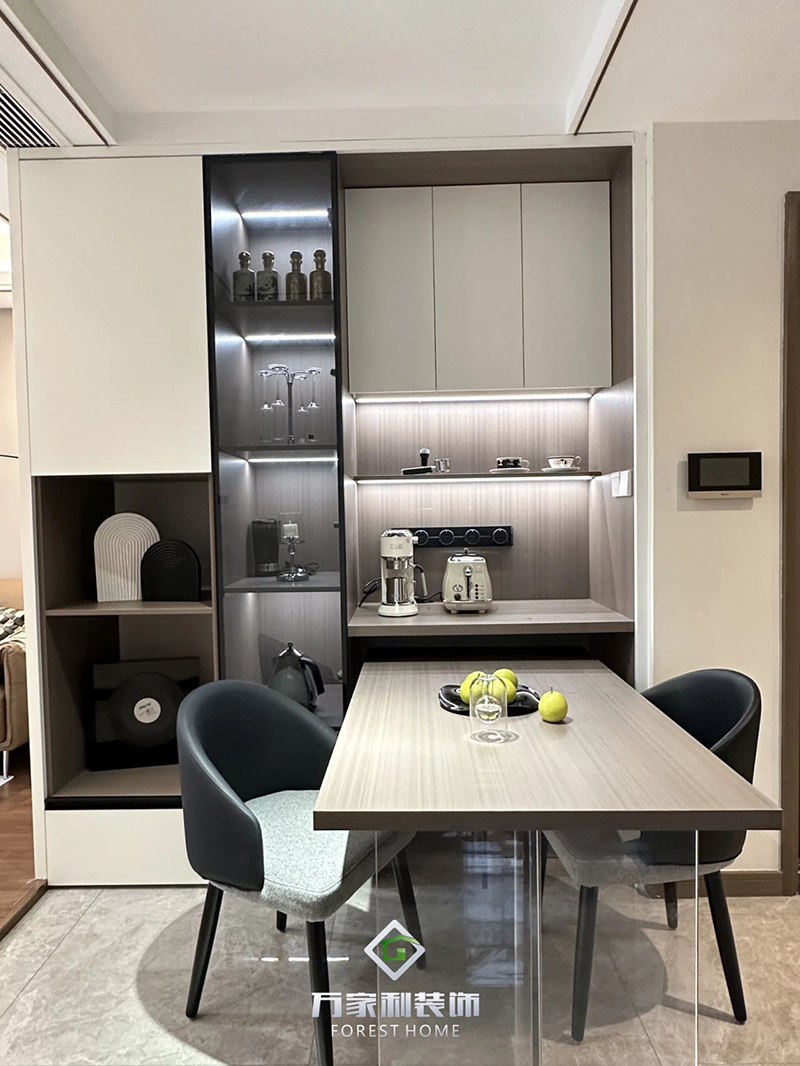 去繁就簡(jiǎn)的配色處理,彰顯優(yōu)雅的格調(diào)。餐邊柜結(jié)合嵌入式的餐桌設(shè)計(jì),使用靈活方便,空間利用更合理。