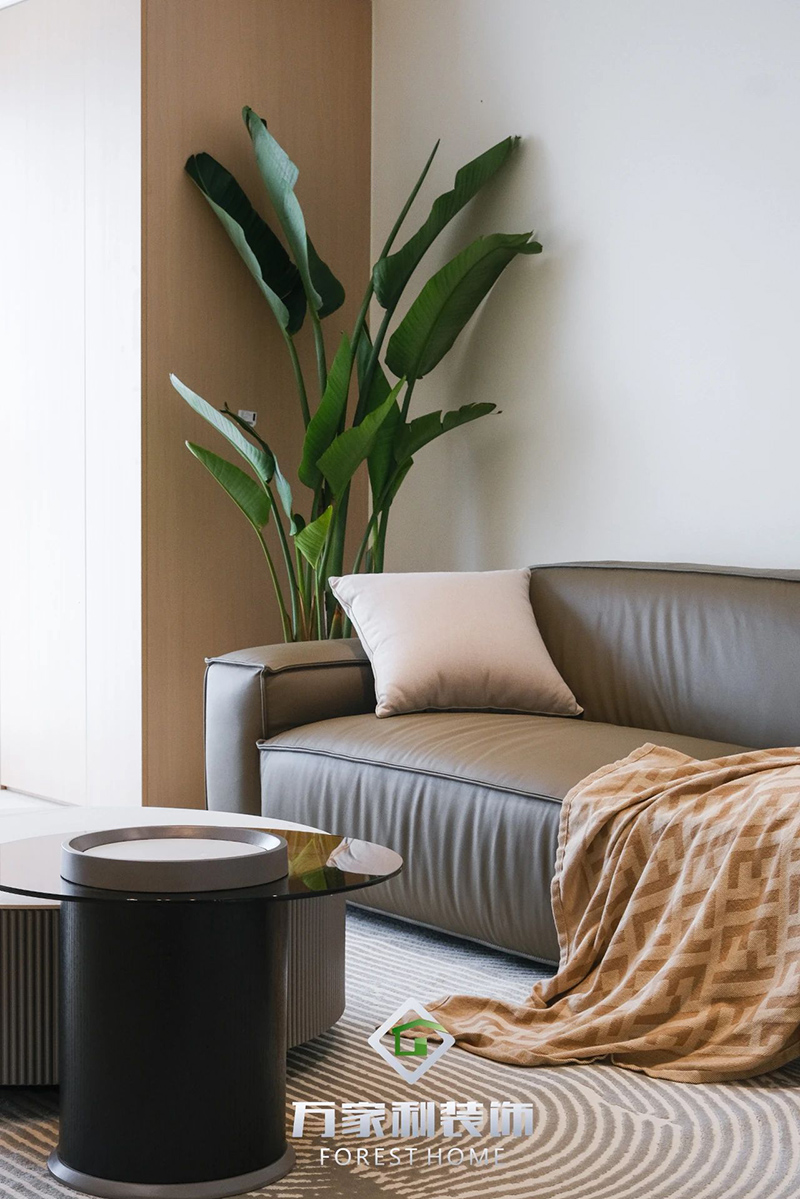 溫軟舒適的皮質(zhì)沙發(fā)承載著日常的休閑活動,綠色植被為空間增添了一抹充滿活力的色彩,使得整個(gè)空間更加自然清新。地毯上動感抽象的線條則在不經(jīng)意間渲染出些許藝術(shù)氣息。
