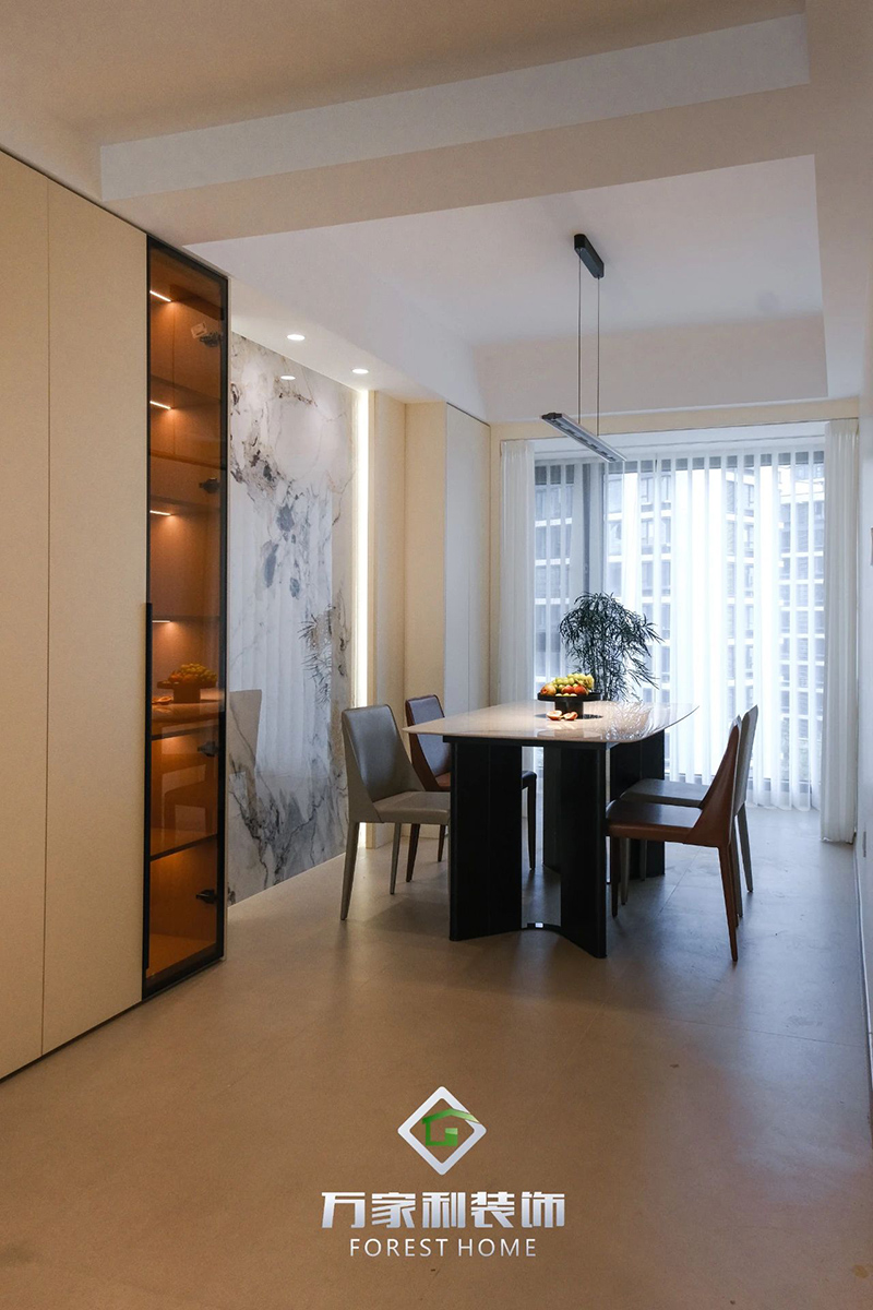 大理石餐桌,簡單自然。餐邊柜收納有序,山水畫背景墻在燈光照射下,二者搭配顯得格外溫柔。