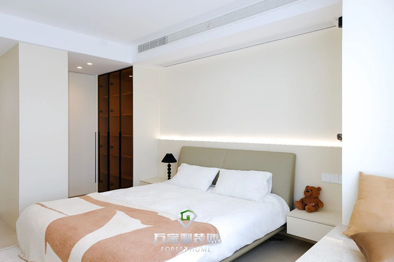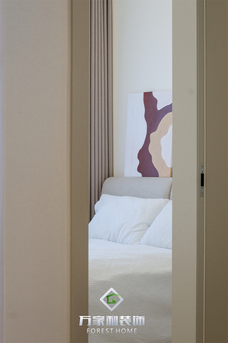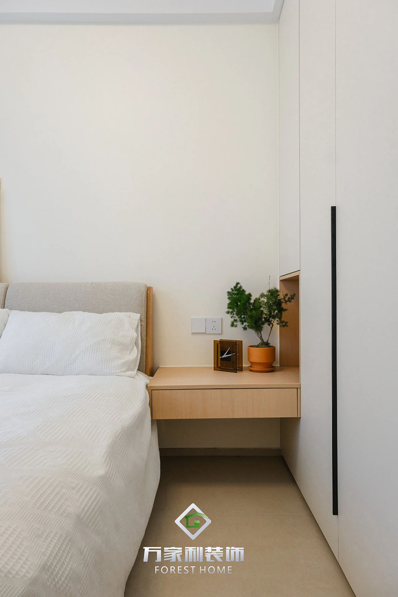 次臥里,干凈的線條和溫馨的色調(diào),創(chuàng)造了一個(gè)沉靜寧謐的休息氛圍。