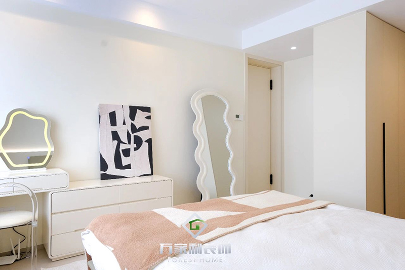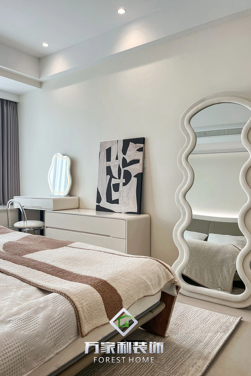 主臥釋放個(gè)性,鏡界網(wǎng)紅波浪鏡與黑白粉碰撞出高級的火花,穩(wěn)重大方卻又不失甜美優(yōu)雅,空間中氤氳著奶油色調(diào)帶來的溫軟與典雅之感。