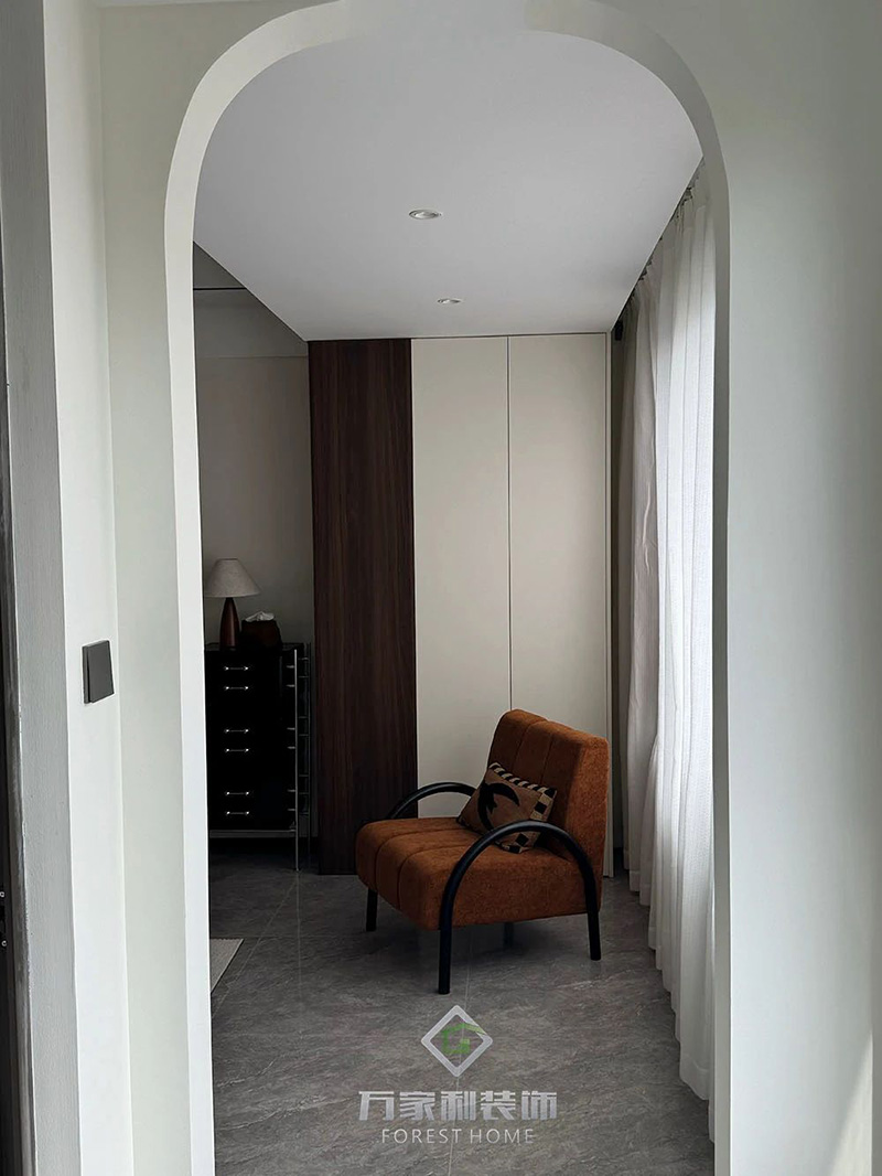 窗邊的休閑角設(shè)計(jì)在追求美觀的同時兼顧舒適感。一把栗棕色的雪尼爾彩虹椅,搭配弧度優(yōu)美的扶手,為這個角落增添了柔和的觸感。清晨的第一縷陽光灑進(jìn)來時,這里成了享受生活、閱讀、思考的完美空間,平靜而溫馨。