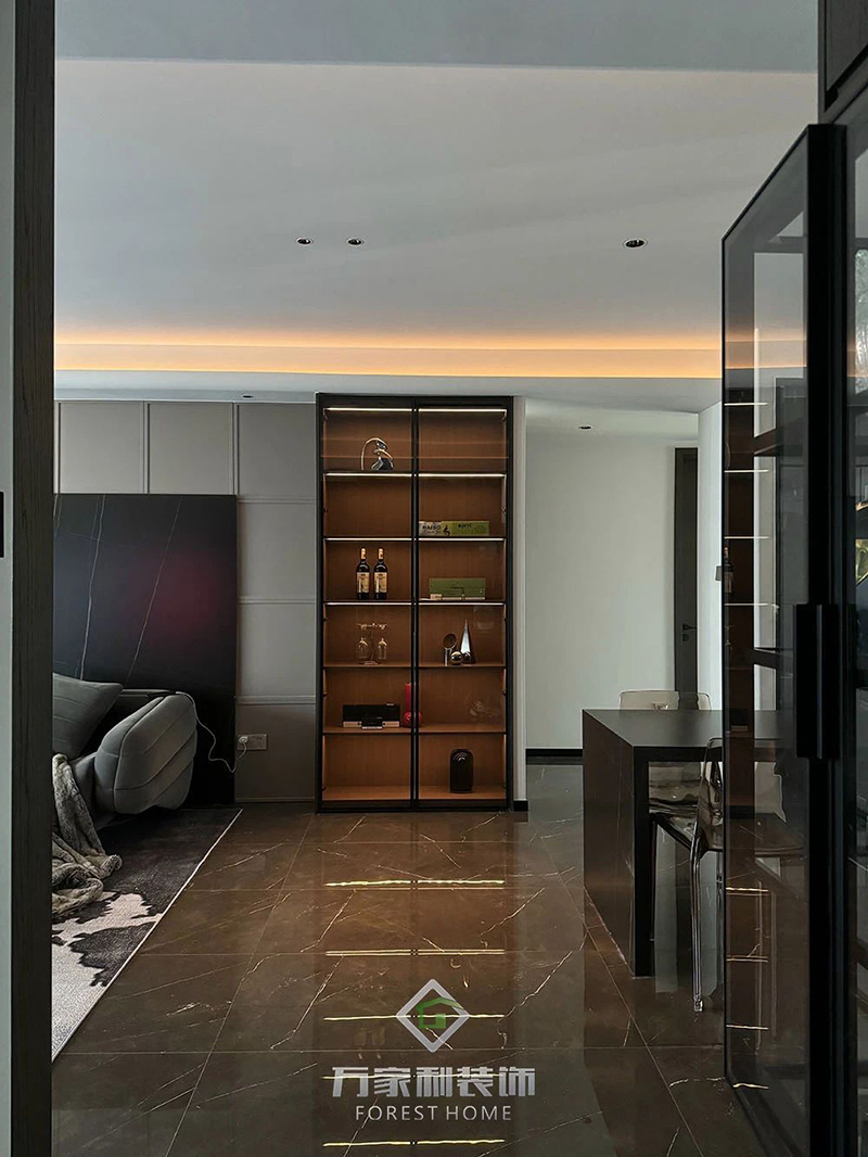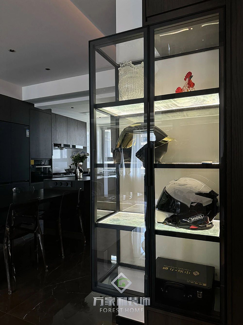 這是一位男士專屬空間,他追求生活的質(zhì)感與情調(diào),享受一杯佳釀帶來的平靜時(shí)光;他是追逐速度與自由的探索者,摩托車承載著他對(duì)未知世界的渴望。設(shè)計(jì)師以現(xiàn)代暗黑風(fēng)為基調(diào),打造了一個(gè)充滿個(gè)性與質(zhì)感的家。