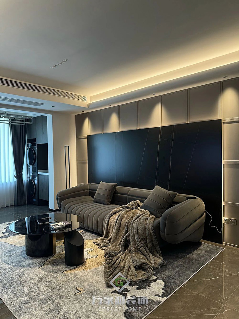 客廳選用了意大利香蕉布藝沙發(fā),低調(diào)的色彩與舒適的質(zhì)感完美結(jié)合,暗黑色調(diào)的背景與沙發(fā)柔和的線條形成強(qiáng)烈的對(duì)比,柔軟與硬朗相融,營造出高級(jí)感。