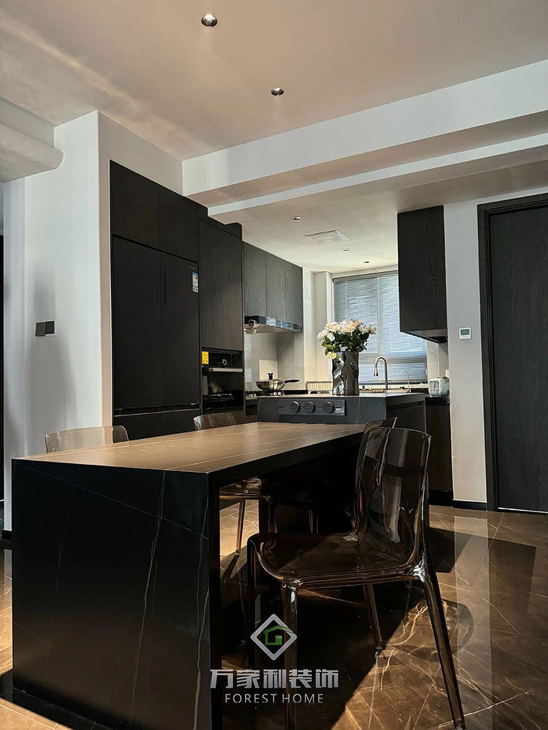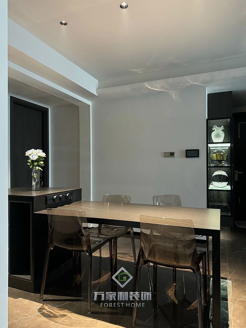 餐廳的透明亞克力餐椅為暗色空間增添輕盈感,簡約設(shè)計(jì)中帶有未來感,更讓整個(gè)暗色調(diào)的空間顯得不沉悶。