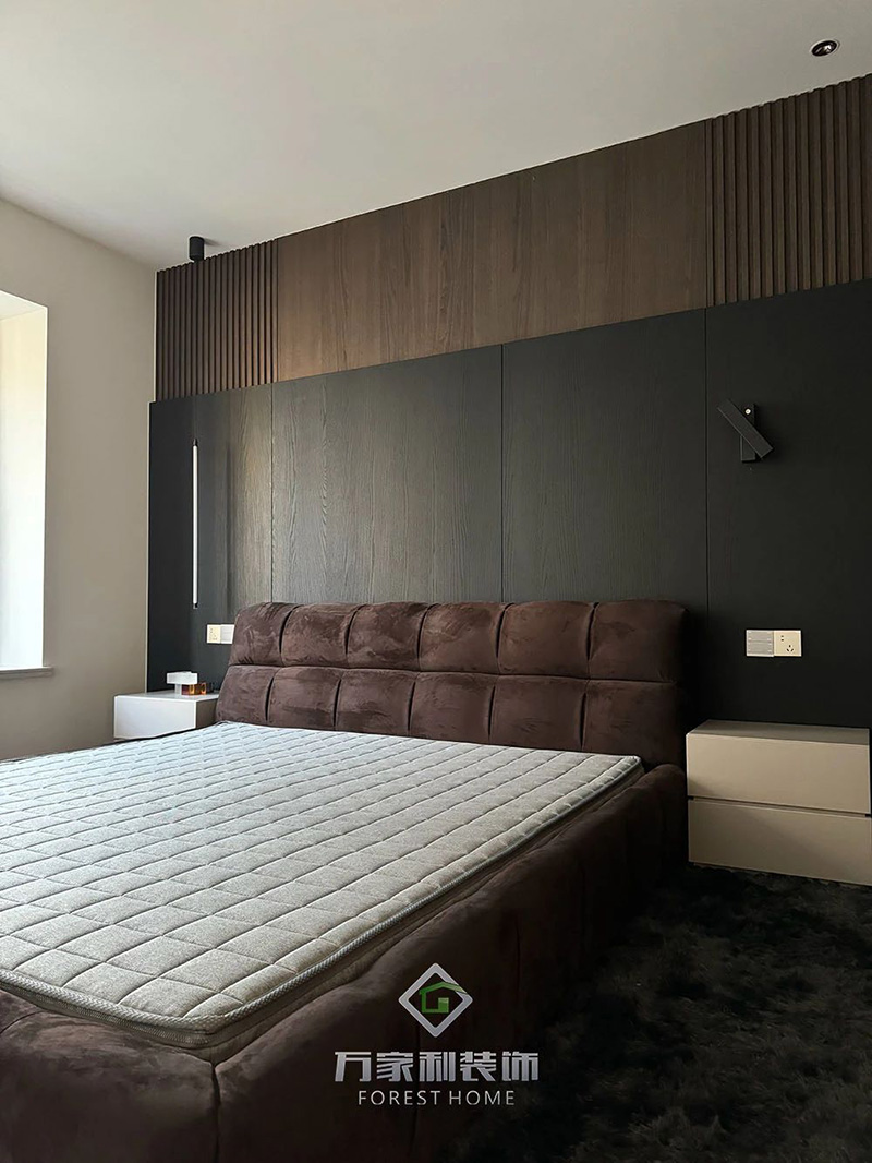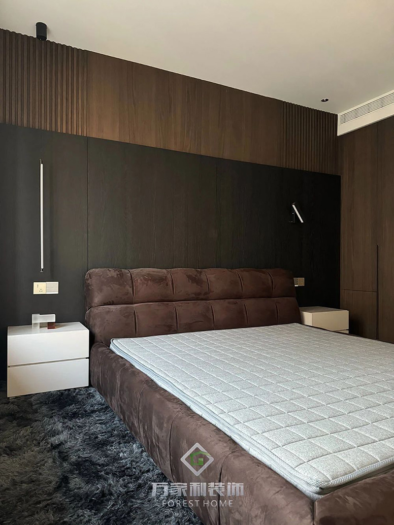輕奢泡芙床與栗棕色木板背景墻:沉穩(wěn)溫暖的臥室氛圍,帶來極致放松體驗(yàn),打造舒適的睡眠環(huán)境。