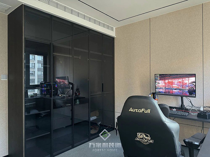 走進(jìn)設(shè)計(jì)師精心打造的電競房,仿佛踏入了一個(gè)充滿未來感的科技世界。舒適的電競椅,貼合人體工學(xué)設(shè)計(jì),讓男主人在游戲中盡享絲滑流暢的操作體驗(yàn),釋放壓力。