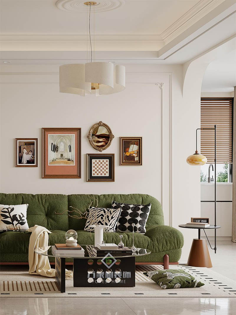 當(dāng)法式復(fù)古風(fēng),遇上一眼心動(dòng)的綠色沙發(fā),像陽(yáng)光透過(guò)樹(shù)影斑駁的光影讓法式復(fù)古風(fēng)客廳變得很有生機(jī)活力充滿森系的復(fù)古浪漫氛圍.