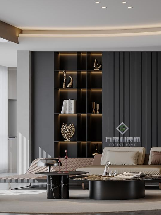 客廳區(qū)域,以儲(chǔ)物和展示為主,鋼琴鍵的柜門,奢石普拉達(dá)綠做點(diǎn)綴,在鏤空和地臺(tái)區(qū)域,再加入氛圍燈,完美結(jié)合。