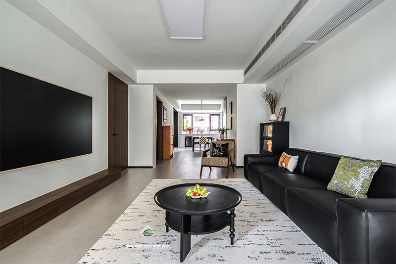 客廳中,經(jīng)典的黑色皮沙發(fā)與木質(zhì)裝飾相映成趣,既有復古的厚重感,又不失現(xiàn)代的舒適。